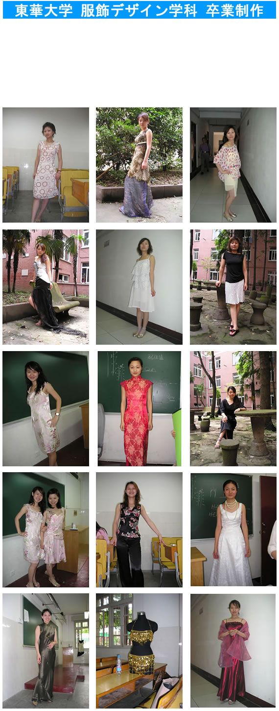 東華大学の服飾デザイン学科(専科=3年コース)の知り合いが、卒業制作で衣服を作ったと言っていたので、卒業前に学校にカメラを持って行って取ってきてもらっました。彼女たちは、デザイン画の作成から生地・附属選び、縫製に至すべての工程を自分でやるそうです。2〜3年間学校で勉強しただけで、実際下の写真のような衣服が作れるのだなーと感心しました。中には、生地を求めて杭州まで足を運んだ学生もいるのだとか。では、実際彼女たちがどれくらいアパレル企業でデザイナーとして就職しているかというと、約半数に止まる程度で、アパレルの販売員や、家具のデザイナーなど、何かしらファッションやデザインに関連する様々な所に就職していくようです。ちなみに、彼女たちにどれくらいの給与がもらえるのかと聞いたところ、外資系に就職が決まった人は月収3000元程度(約4万2千円)、香港系、台湾系を含む国内系企業だと条件のいい所で1500元、一般的には1000元+わずかな残業代くらいの給与しかもらえないのだそうです。それでは、家賃の高い上海では一人暮らしなどとうていできないので、多い人は6人二部屋、少ない人でも友達と2人で一部屋を借りて住むのだそうです。