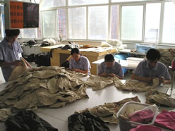 今回は、アメリカと大連の合弁ブランド「MEIOULAN(美欧嵐)」の高社長(右写真:真ん中)にお話を伺いました。「MEIOULAN」は大連を中心に、中国全土で100前後の専門店を持つブランドで、大連保税区内に自社工場を持っておられます。今回は工場の見学も兼ねてお邪魔しました。